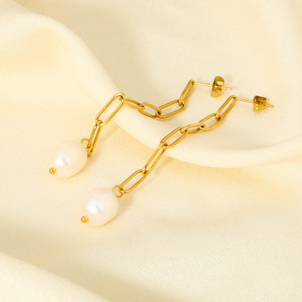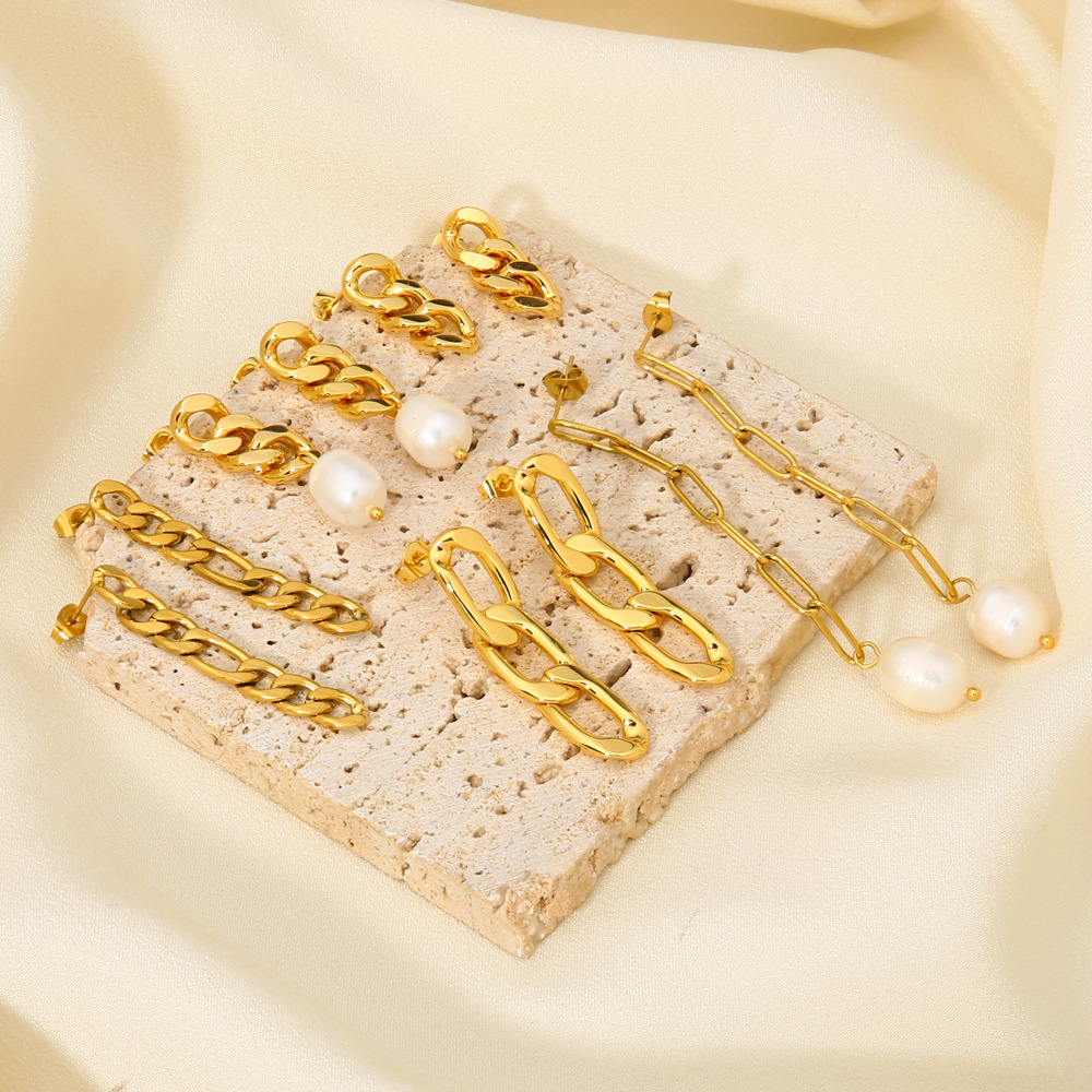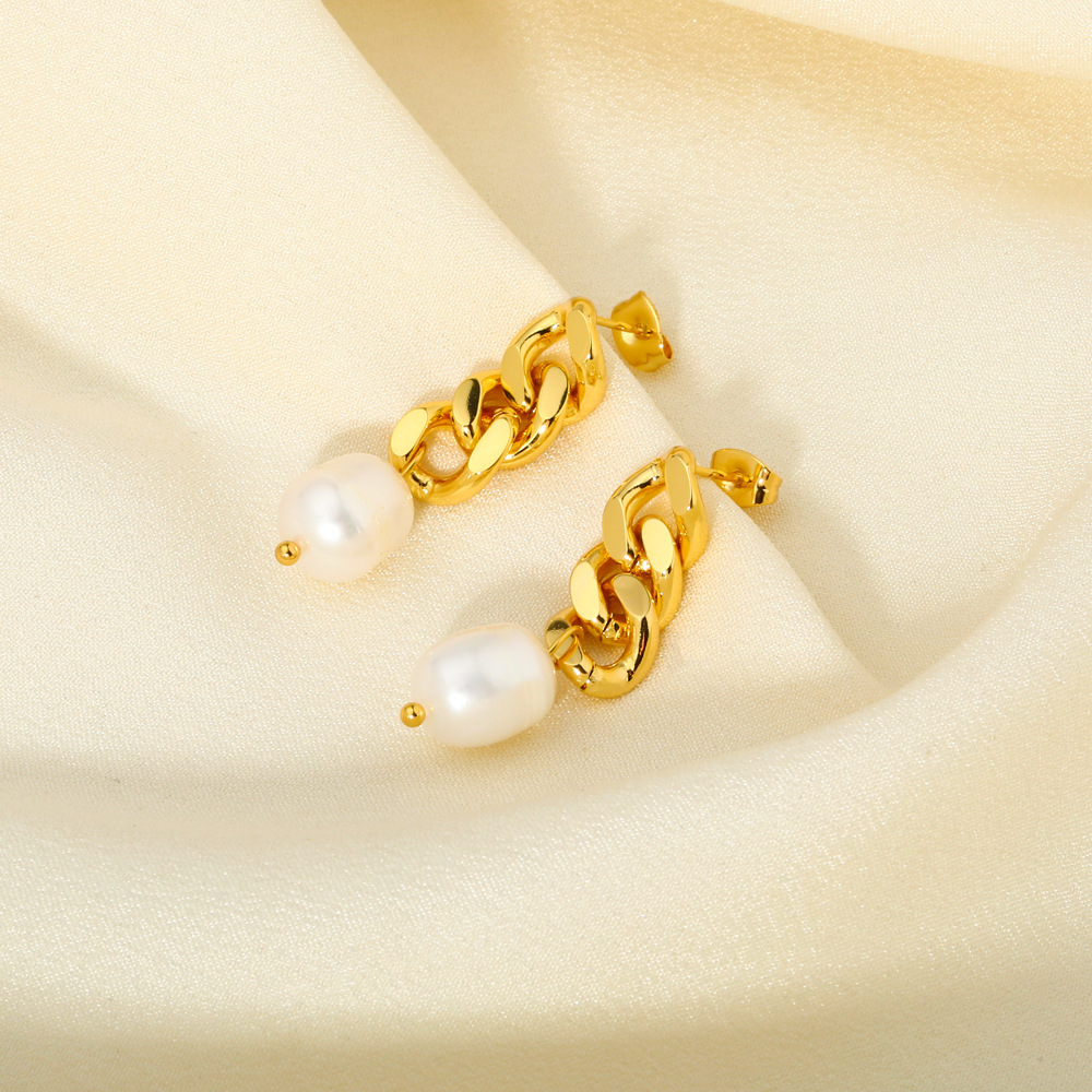 Cuban Link Chain Earrings, Stainless Steel High-end Natural Freshwater Pearl Dangles 18K Gold-plated Jewelry