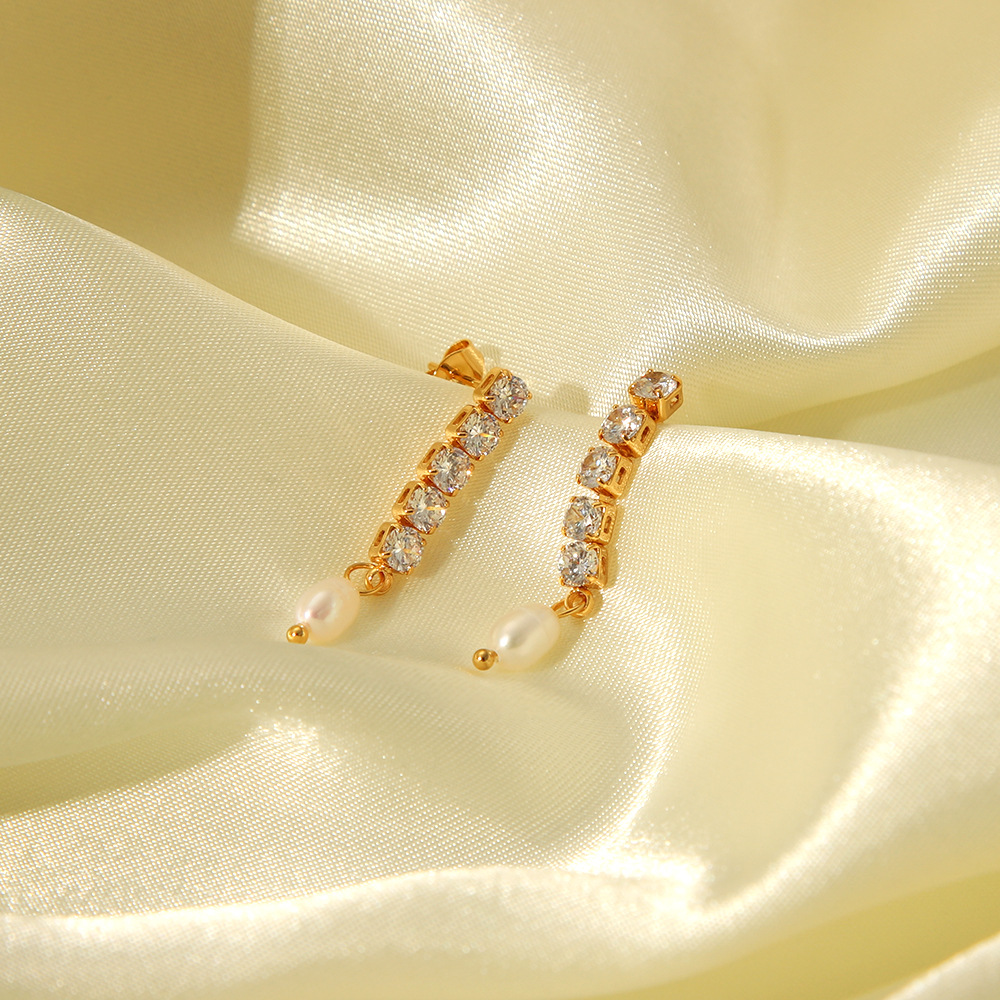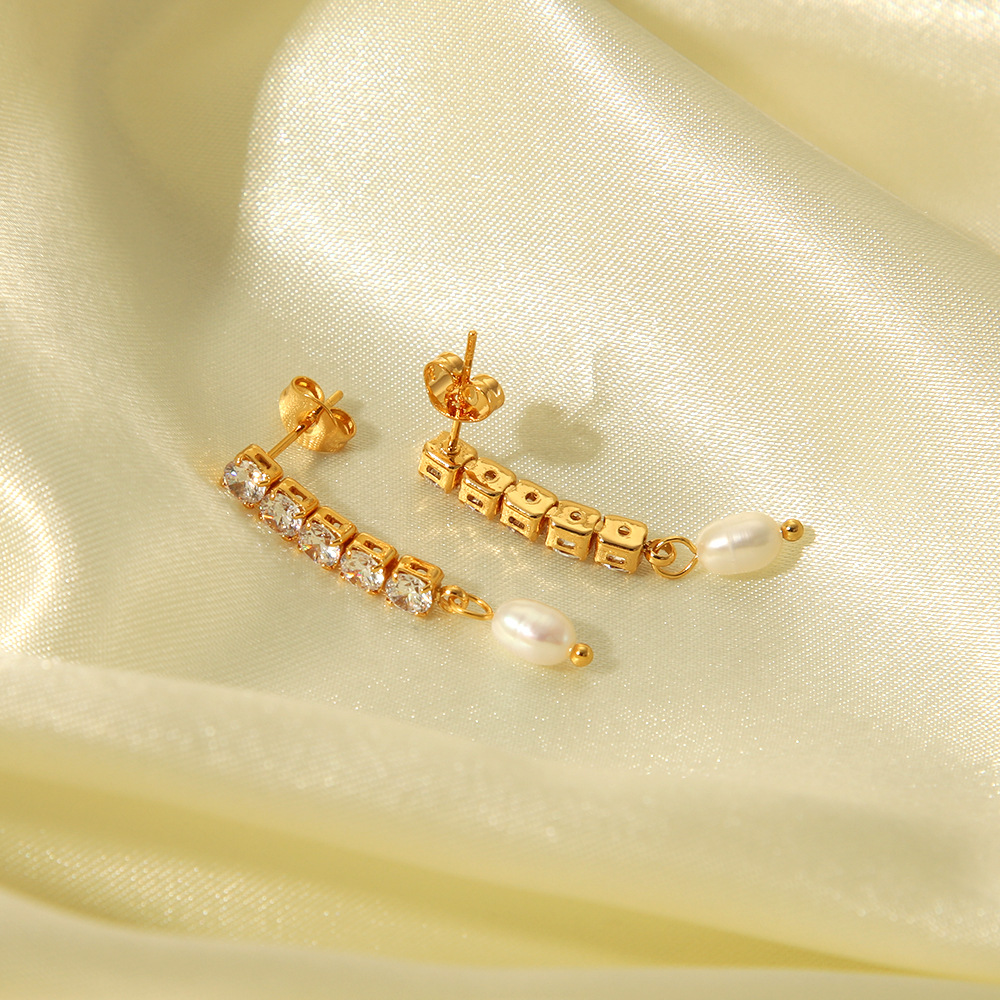 Stylish Freshwater Pearl Earrings - Stainless Steel 18K Gold Zircon Chain Dangles Jewelry for Wholesale